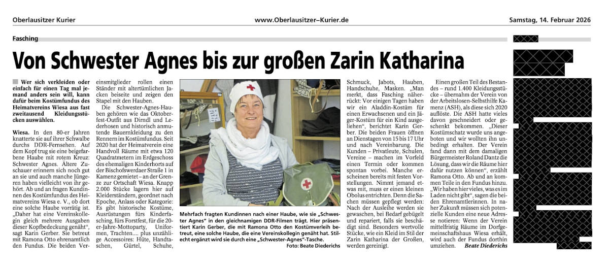 Presseartikel vom Oberlausitzer Kurier, 14. Februar 2026 über den Fundus des Heimatvereins Wiesa e.V.